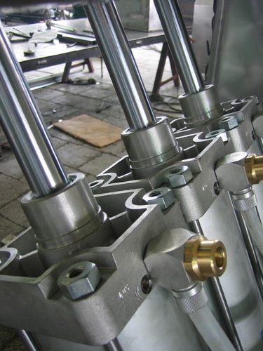 Zasada działania oparta jest na ruchomych ramionach podnoszących pojemnik z wsadem, który poprzez regulowany na wysokość lej zasypowy trafia do zbiornika masowania masownicy próżniowej. Ramiona podnoszone są za pomocą trzech siłowników pneumatycznych zamocowanych na ramie.